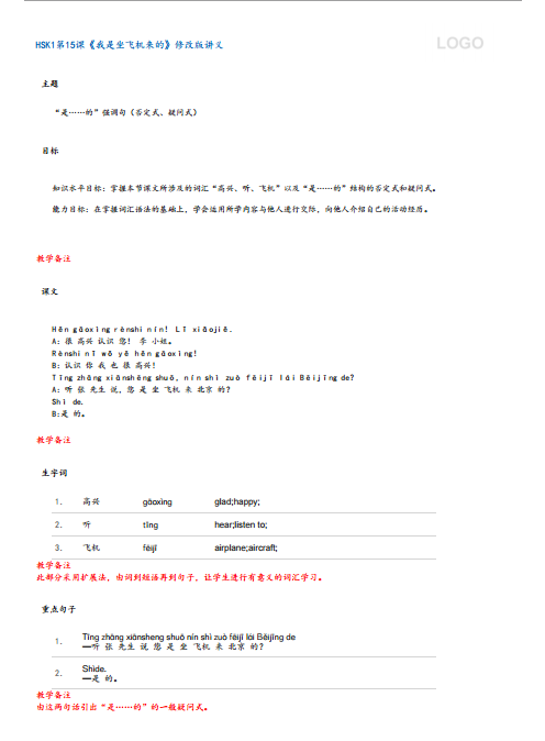 HSK1第15课《我是坐飞机来的》修改版讲义